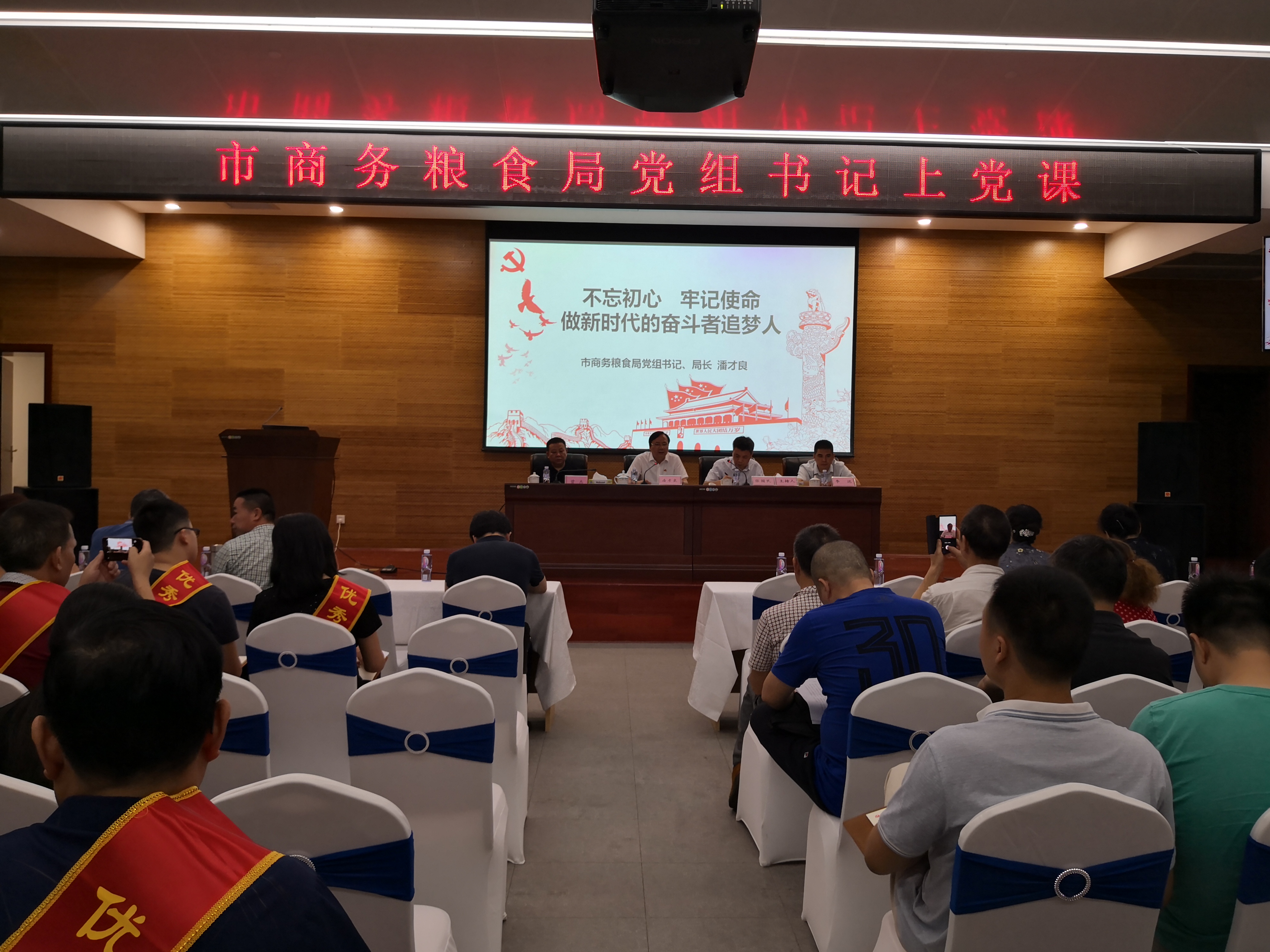 最后,局党组书记、局长潘才良同志为全体与会人员上了一堂题为《不忘初心、牢记使命,做新时代的奋斗者追梦人》的党课,他强调要坚守初心,做到信念坚定跟党走,不断锤炼坚强党性、锤炼过硬作风、锤炼健康心态;要牢记使命,做到责任上肩不推脱,要敢于担当不推诿、积极主动不拖拉、严于律己不忽悠;要努力奋斗,做新时代商务粮食事业的追梦人,要在开放发展、招商引资、对外贸易、内贸流通、粮食发展5个方面28项重点工作上取得新成效、新突破,培育新优势、争创新作为、再上新台阶。
