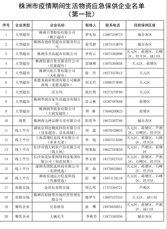 现将疫情期间株洲市生活物资应急保供企业名单(第一批)公布如下: