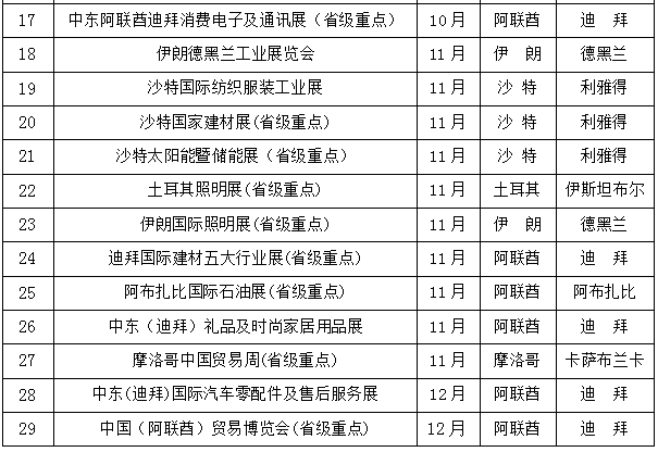 为贯彻落实习近平外交思想,共建中阿命运共同体,切实推进“五大合作格局”,指导企业通过境外展会平台以展促贸开拓中东市场,深化我市与中东地区经贸合作交流,进一步优化出口商品结构和国际市场布局,根据我市产业结构特点制定了《2024年中东地区国际展会推荐名录》。现予以公布,供有关单位参考。