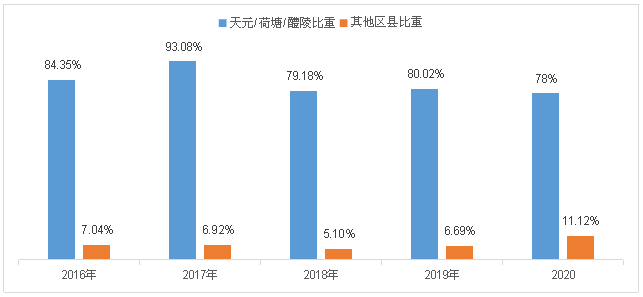 外贸主体结构单一。全市有外贸业绩的实体企业占企业总数不足10%,且民营企业所占份额偏低。中车集团在株企业、株硬集团、株冶、南方航空等国企进出口额占全市54%以上。外贸发展地域不平衡,2020年,天元区、醴陵市和荷塘区的进出口占全市近80%,其中天元区进出口占全市55%以上,芦淞区、石峰区、渌口区、攸县、茶陵、炎陵县六区县进出口仅占全市10%左右(见图4)。