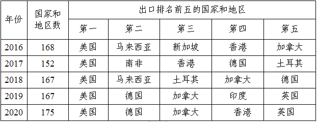 对外贸易市场更加多元化。截至2020年底,累计与170多个国家和地区有经贸往来,主要贸易地区有欧洲、北美洲、亚洲、大洋洲等,主要贸易伙伴有美国、德国、澳大利亚、加拿大、英国、日本、印度、马来西亚等。出口前5位的国家或地区分别是美国、德国、加拿大、香港和英国,进口前5位的国家为德国、澳大利亚、日本、美国和英国,并向东南亚、非洲、中东、大洋洲、南美、俄东地区等新兴市场扩展,呈现多元化格局(见表1)。
