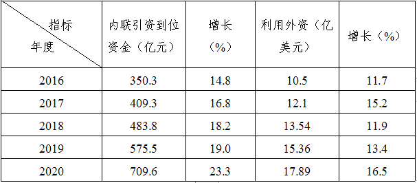 招商引资规模不断扩大。“十三五”期间,全市招商引资能力显著增强,内联引资项目与到位资金持续增长。2020年,全市累计内联引资到位资金709.6亿元,比“十三五”期初增加132.7%,年均增长18.4%;实际利用外资17.89亿美元,比“十三五”期初增加90.3%,年均增长13.7%。见表2。