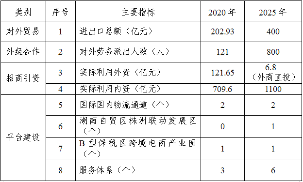 对外贸易持续发展。不断培育外贸新动能。依托“湖南自贸区株洲联动发展区”与自贸区在制度、产业、平台一体化创新发展等方面的对接和先行先试取得突破,外贸新模式、新业态不断涌现。到2025年,实现进出口400亿元以上,年均增长15%以上。进出口结构不断优化,到2025年,机电产品、高新技术产品分别占全市外贸65%和18%以上。贸易主体进一步壮大,全市有进出口实绩的企业达到1000家以上,进出口超过1亿元的企业50家以上,进出口额过10亿元企业数15家以上。