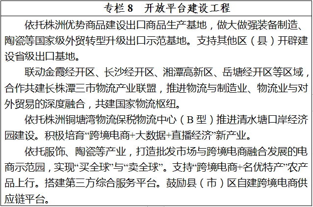 平台作用充分发挥。主动对接湖南自贸区,建设湖南自贸区联动发展区;株洲铜塘湾保税物流中心(B型)功能作用充分发挥,畅通国内国际物流双通道。到2025年,建成国际国内物流通道2个、省级出口基地3个、B型保税区跨境电商产业园1个、数字化转型开放平台1个。