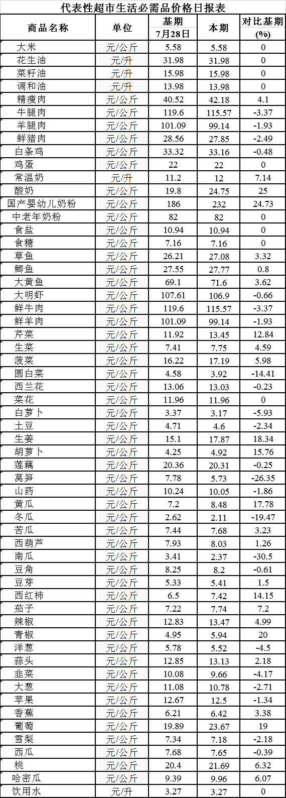 据市商务和粮食局监测,8月5日,全市生活必需品价格总体平稳。代表性商超生活必需品零售价,大米5.58元/公斤,对比以本轮疫情前(下同)上涨0%;菜籽油15.98元/升,上涨0%;鲜猪肉27.85元/公斤,下降2.49%;鸡蛋22元/公斤,上涨0%;蔬菜8.73元/公斤,上涨0%。