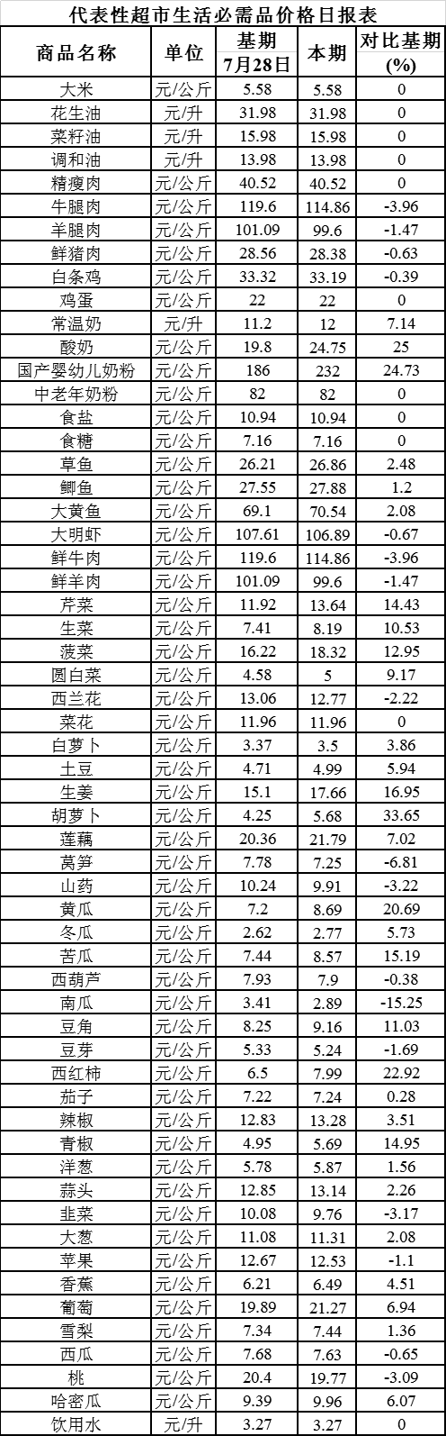 据市商务和粮食局监测,8月7日,全市生活必需品价格总体平稳。代表性商超生活必需品零售价,大米5.58元/公斤,对比以本轮疫情前(下同)上涨0%;菜籽油15.98元/升,上涨0%;鲜猪肉28.38元/公斤,下降0.63%;鸡蛋22元/公斤,上涨0%;蔬菜9.29元/公斤,上涨6.44%。