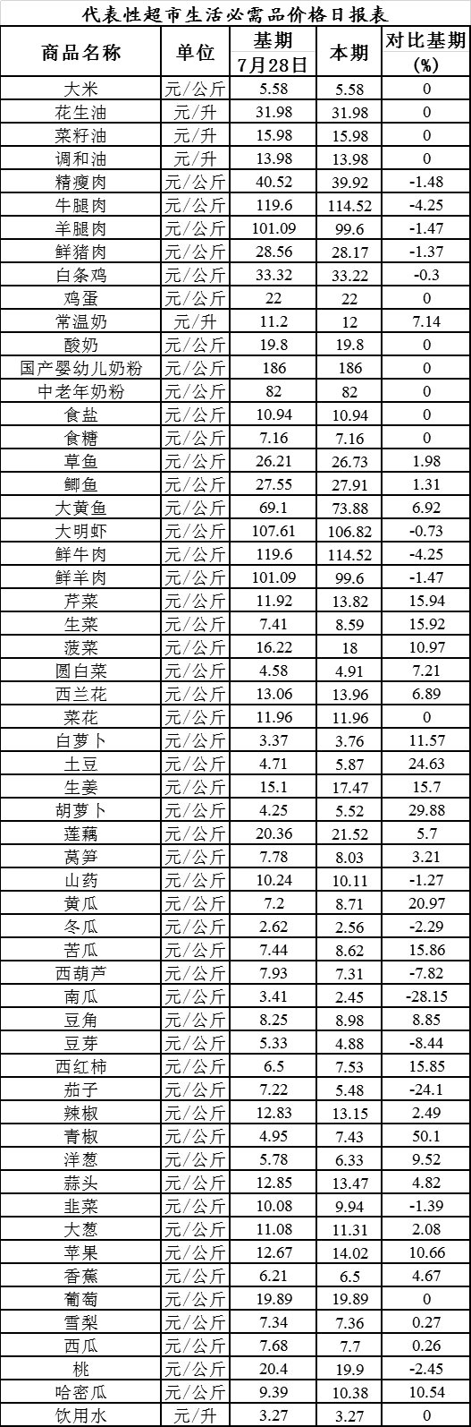 据市商务和粮食局监测,8月12日,全市生活必需品价格总体平稳。代表性商超生活必需品零售价,大米5.58元/公斤,对比以本轮疫情前(下同)上涨0%;菜籽油15.98元/升,上涨0%;鲜猪肉28.17元/公斤,下降1.37%;鸡蛋22元/公斤,上涨0%;蔬菜9.3元/公斤,上涨7%。