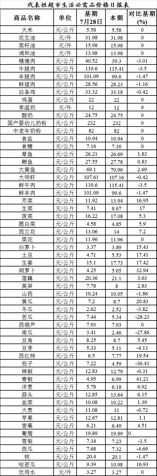 据市商务和粮食局监测,8月13日,全市生活必需品价格总体平稳。代表性商超生活必需品零售价,大米5.58元/公斤,对比以本轮疫情前(下同)上涨0%;菜籽油15.98元/升,上涨0%;鲜猪肉28.23元/公斤,下降1.16%;鸡蛋22元/公斤,上涨0%;蔬菜9.15元/公斤,上涨5.2%。
